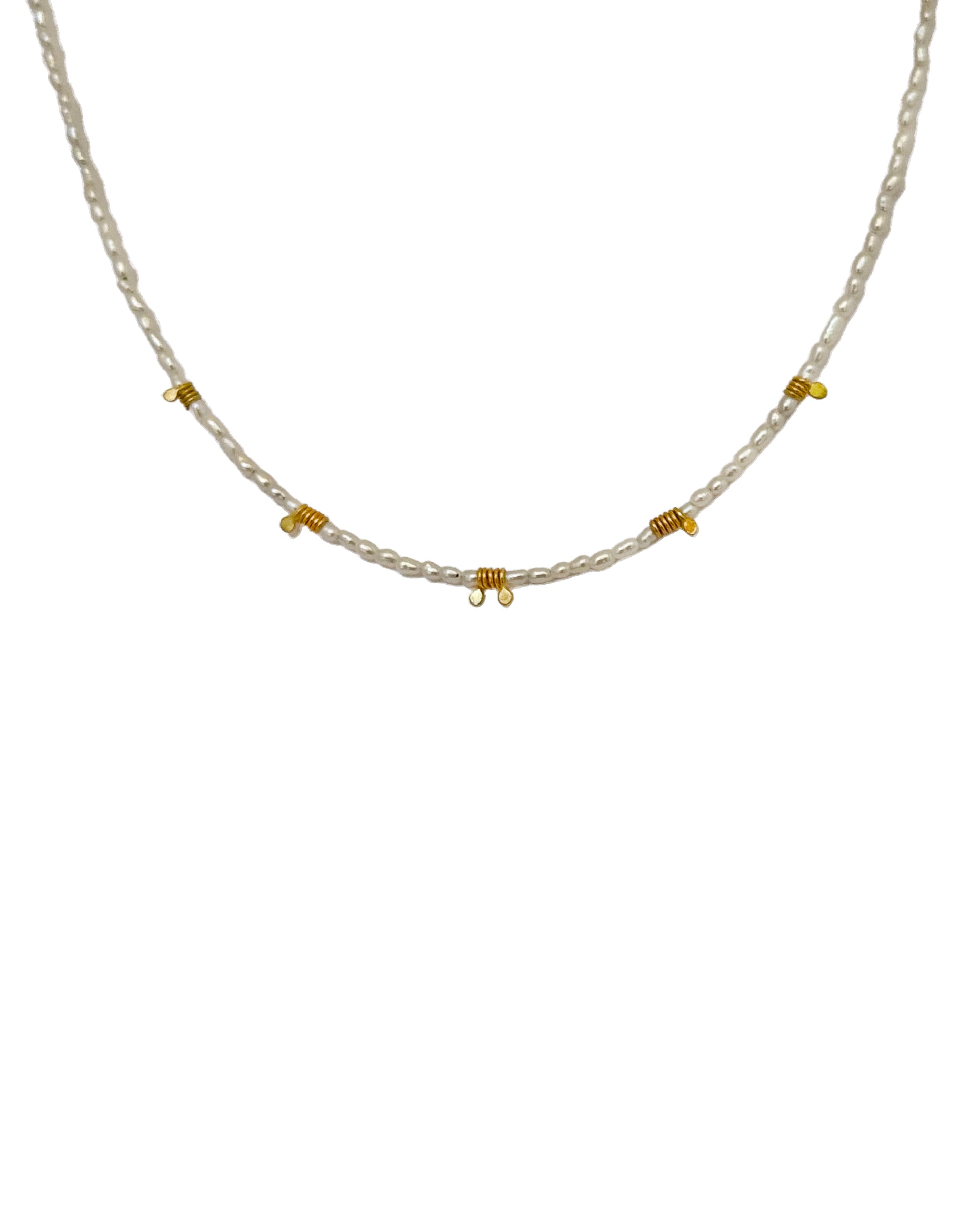 This delicate white freshwater seed pearl necklace combines the purity of pearls with the artistry of hand-coiled 18kt yellow gold spirals, creating a piece that radiates timeless elegance. The minimalist design highlights the textural contrast between the lustrous pearls and the intricate, hand wound gold coils, showcasing exceptional craftsmanship. Versatile and refined, this necklace can be worn alone for a subtle statement or layered for a more dynamic look. Perfect for any occasion, it offers a harmonious blend of sophistication and artisanal detail that elevates everyday style.